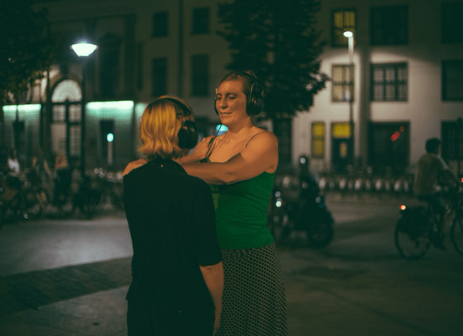 The experience unfolds through two distinct yet interconnected audio tracks lasting approximately 12 minutes, delivered in English via headphones. As participants follow instructions, they trace invisible paths, engaging in movements that mirror each other’s presence across the space.