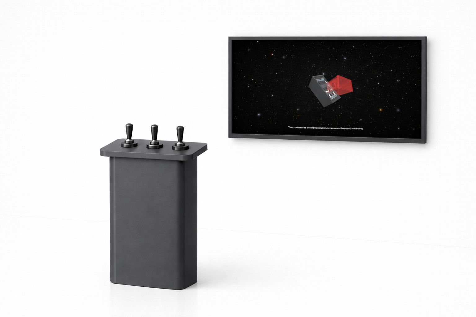 The work takes the form of a short playable video game presented through a freestanding control pedestal with three industrial joysticks, positioned in front of a wall mounted screen. On the display, a 3D abstracted server rack drifts and rotates slowly in deep space. Using the three joysticks, the visitor continuously stabilises the server’s movement across three axes while the system responds in real time. Throughout this interaction, a spoken monologue unfolds from the perspective of the machine itself.